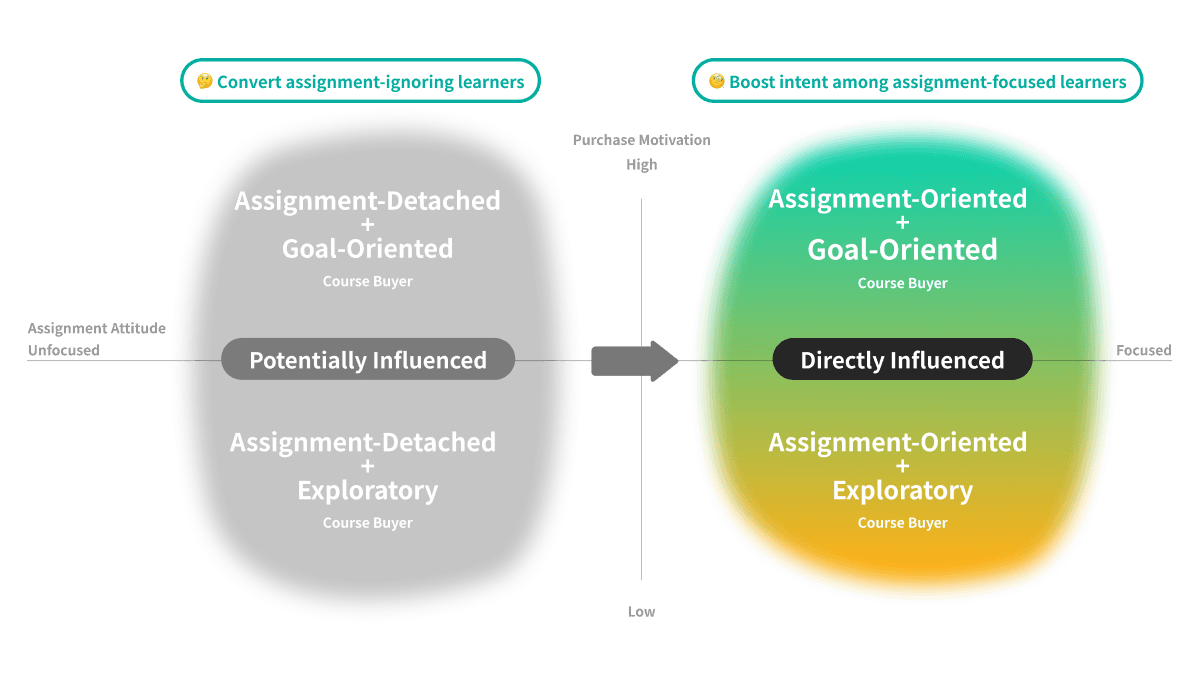From interview feedback, we outlined user profiles based on their attitudes toward assignments and their motivations for purchasing courses. We identified four distinct quadrants, aiming to increase purchase intent among users who currently place low value on assignments by enhancing the appeal of assignment displays.
