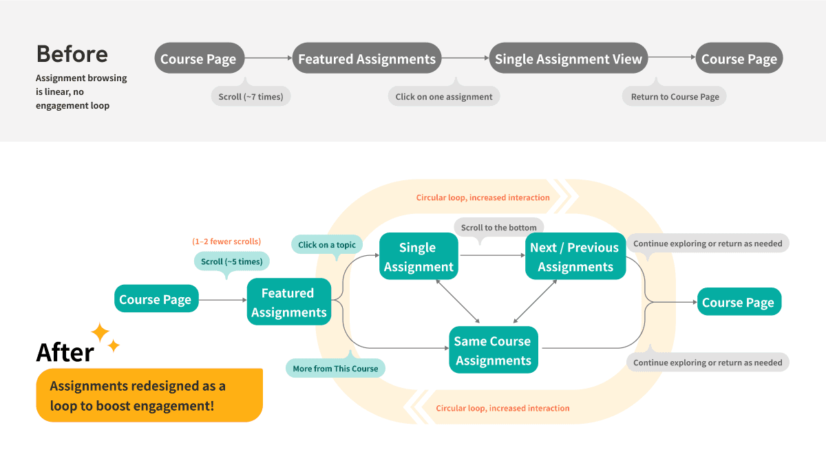 The original one-way browsing flow was redesigned into a multi-directional loop, turning assignment viewing into an experience of exploring course possibilities.